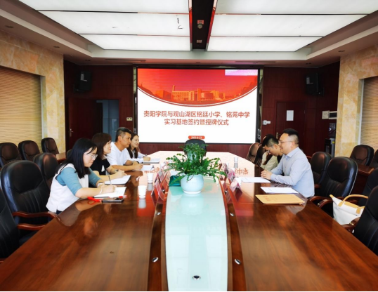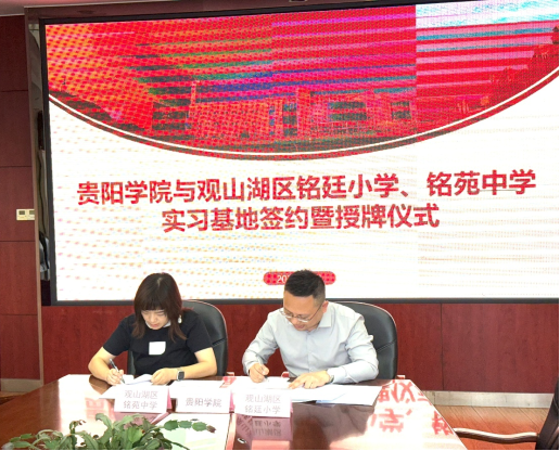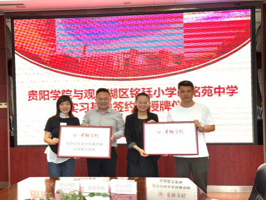 2025年9月23日,永利3044noc实践教学基地在观山湖区铭廷小学、铭苑中学挂牌。永利3044noc经理王刚、副经理杨菁、党政办主任石金、副教授姜楠,以及观山湖区铭苑中学和铭廷小学董事长胡蓉、副董事长孙应权、教师刘淋和廖芳珍参加了签约暨授牌仪式。